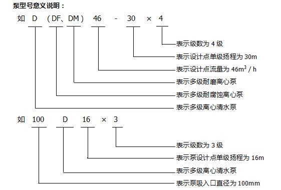 注:D、DM、DF80-30為習(xí)慣表示方法,其中80為泵入口直徑80mm,30為泵設(shè)計點單級揚程30m,其它含義與上述表示方法相同。