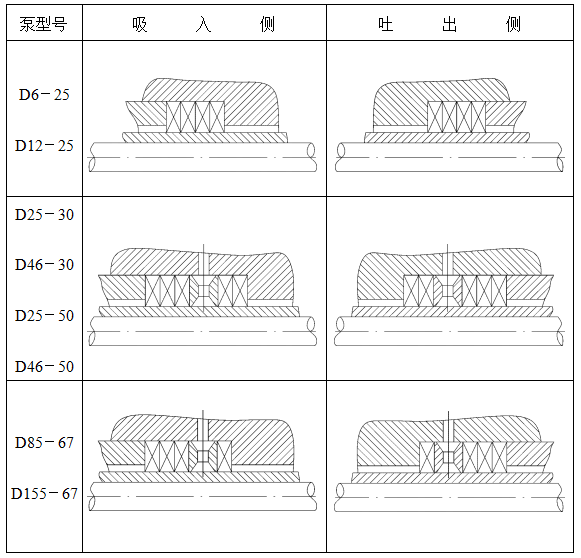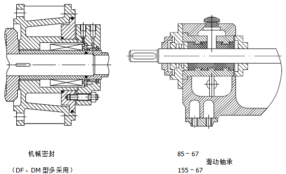 D、DM、DF型泵系臥式、單吸、分段式多級離心泵。D型泵的吸入口為水平方向,吐出口為垂直向上;DF、DM型泵的吐出口和吸入口(僅DF155-30的吸入口為水平方向)均垂直向上。用拉緊螺栓將泵的吸入段、中段、吐出段、軸承體等泵殼體部分聯(lián)結(jié)成一體。根據(jù)泵的揚程選擇泵的級數(shù)。
